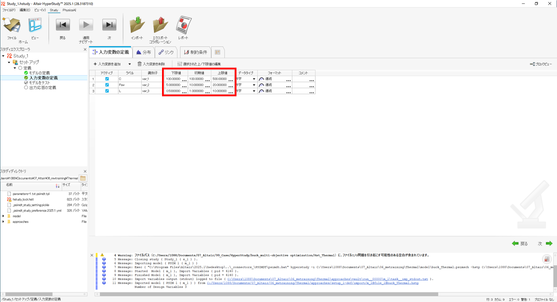 HyperStudyの新規ファイルを作成し、PSIMの回路ファイルを読み込みます。「変数のインポート」から変数を読み込み、