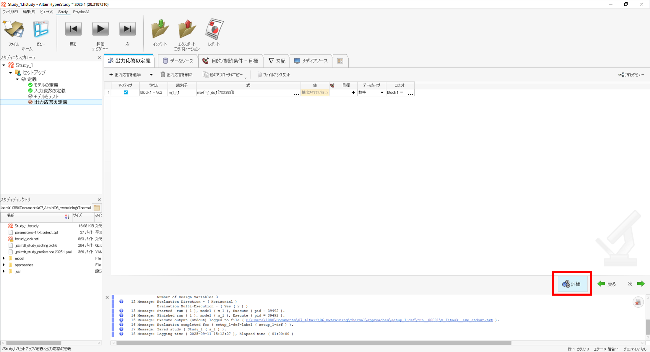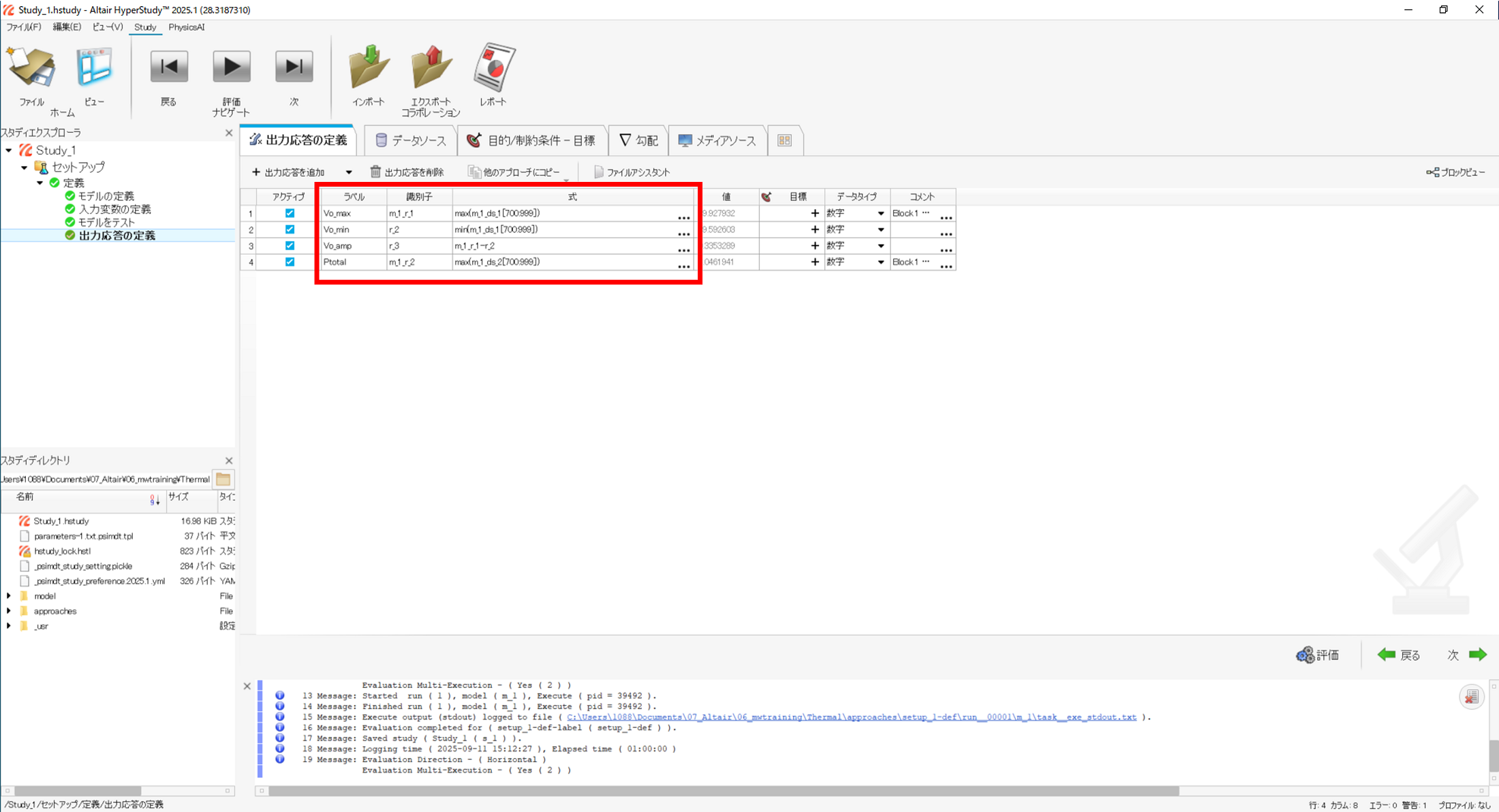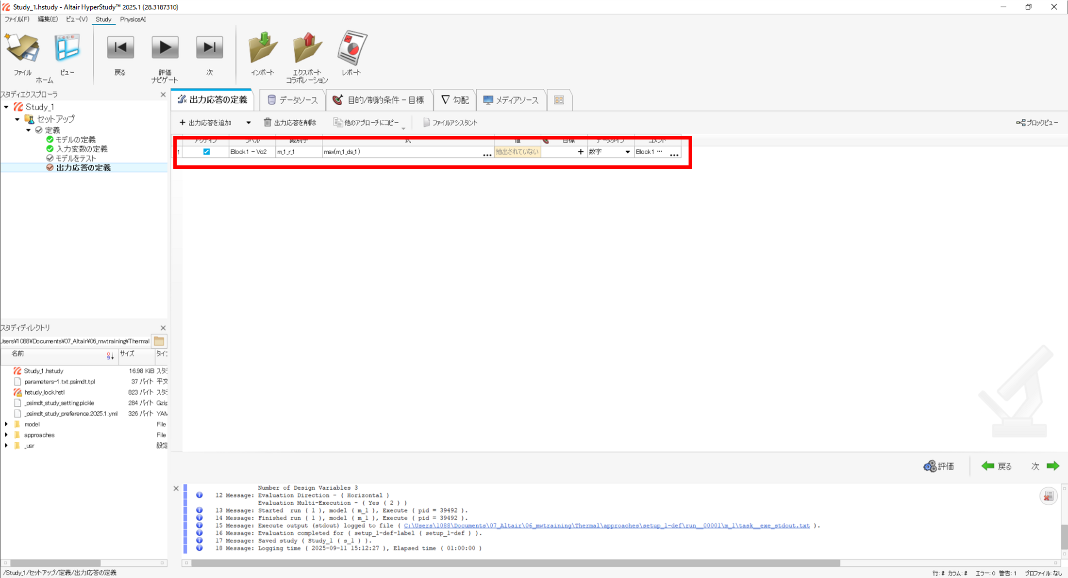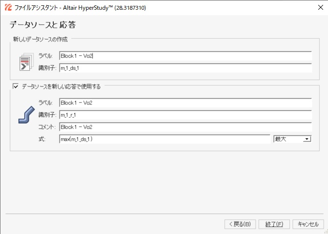 式で「最大」を選択し、「終了」をクリックすると、HyperStudyの出力応答が入力されます。