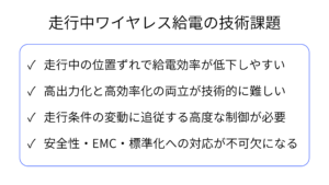 一方で、走行中ワイヤレス給電の実用化には多くの技術課題があります。