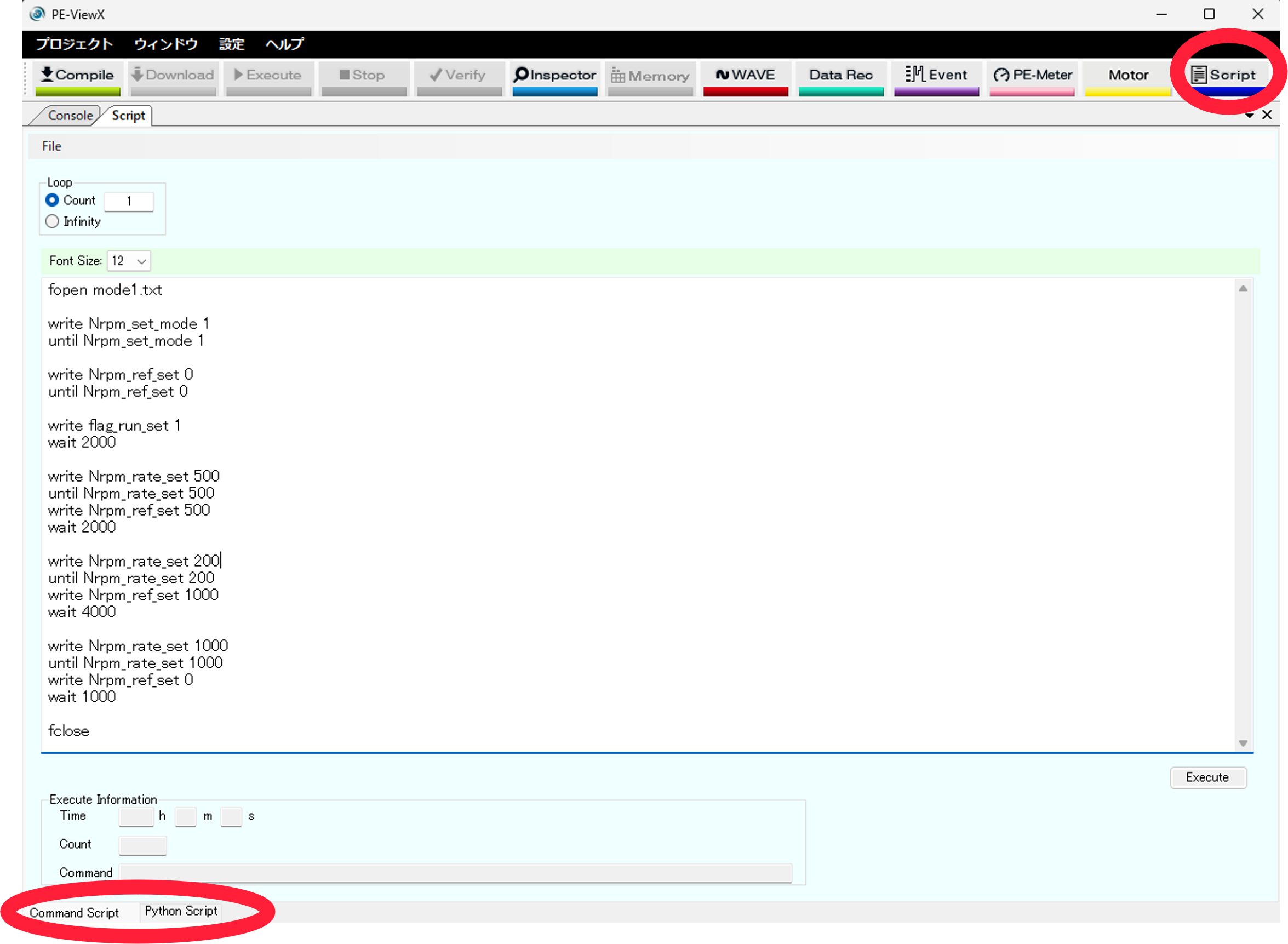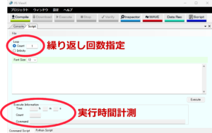 コマンドスクリプト 従来の「外部連成テキストモード」をScriptタブで扱いやすくしたもの 主なポイント ・SaveScriptで作成したスクリプトを保存 ・LoadScriptで保存したスクリプトを読み込み ・スクリプトを指定回数~無制限まで繰り返し実行 ・実行時間の計測も可能
